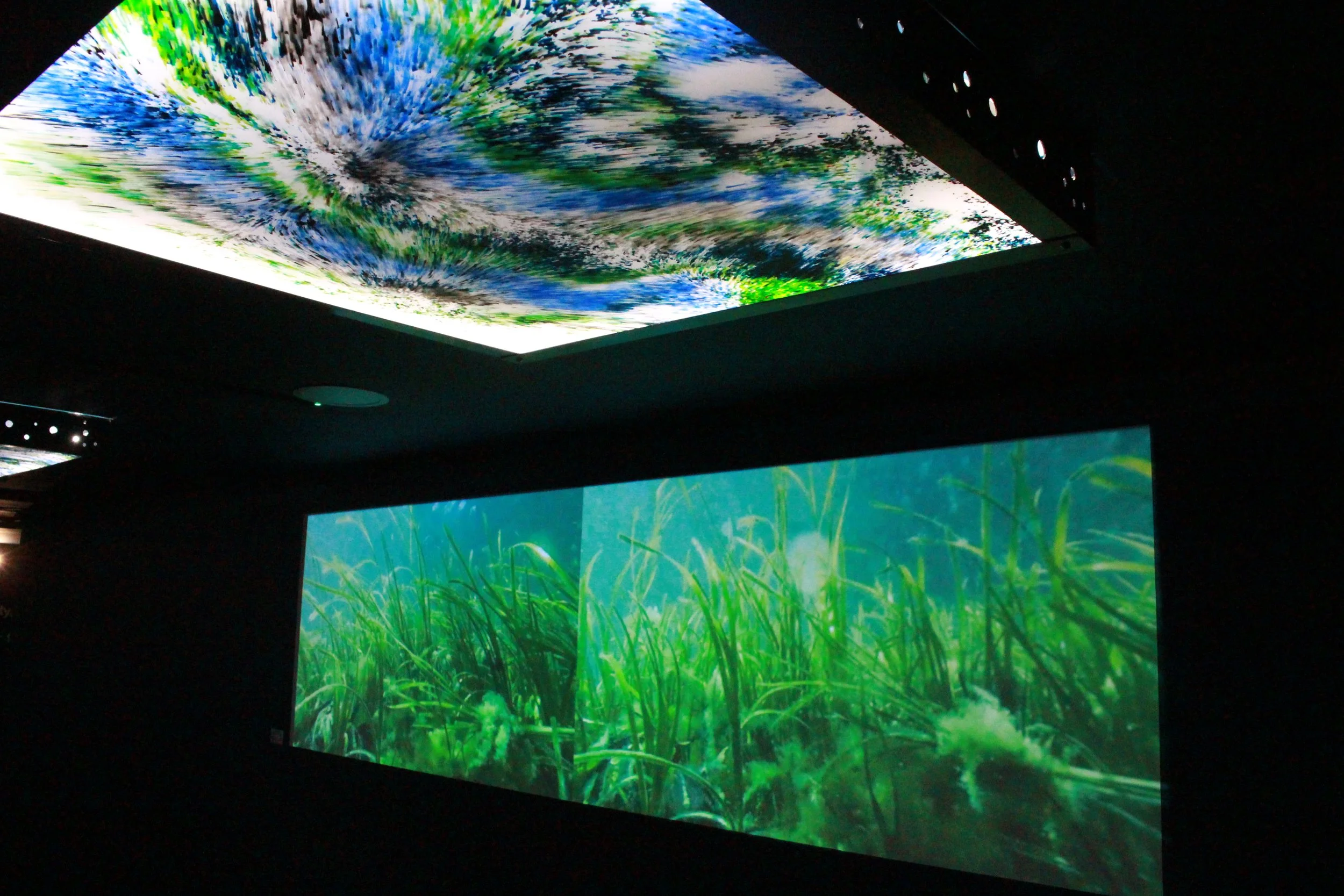 The Seagrass Walk is comprised of light and sound, bringing together underwater photography, video art, sculpture and an ocean-inspired soundscape to create the sensation of the seabed. Sherwood sought out an old analogue underwater film camera to capture the colourful underwater seagrass meadows with all the depth and richness film provides. Venturing along England’s southwest coast in search of seagrass, Sherwood recorded footage using GoPro cameras, concrete weights, and a remote-operated underwater vehicle. Leaving the camera rolling underwater for hours, she would return to fish it out with the help of a buoy attached to the camera weight with a long rope. She edited this footage into a split screen 10 minute video with a soundscape composed by Simon Tassano (Rumiville Music).