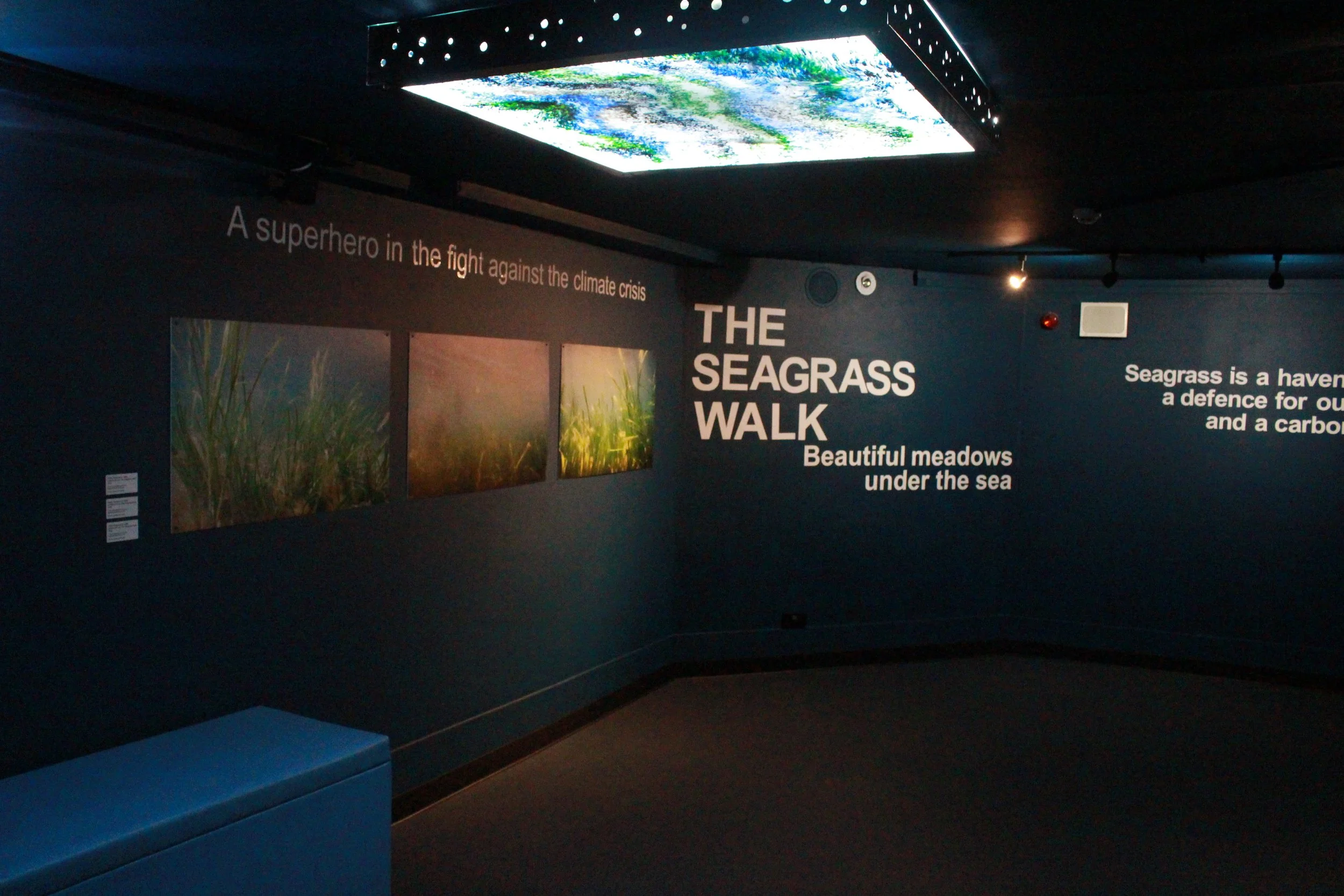 The Seagrass Walk occupies a corridor of the National Aquarium, where Sherwood transformed the space to bathe visitors in ocean-inspired colour through a hybrid of sculpture and light art. Using recycled ocean plastic, Sherwood designed four unique sculptural light boxes, which she fixed to the ceiling and backlit. Fabricated by Ocean Plastic Technologies – a company working to remove litter from our oceans to advance a sustainable and inclusive waste plastic economy that drives entrepreneurship, wealth creation and community development – the light boxes are inspired in equal measure by the colours and shapes of fish tanks, waves and seagrass meadows, combining the world beneath the ocean with our experience at its edges and inside the National Marine Aquarium.